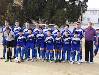 PARTIDO MUY SERIO DEL CADETE "B".- Nuevo empate, esta vez con el tercer clasificado, el Sidonia Balompié, en un partido muy bien disputado por los pupilos de David Lara y Lazaro Zayas y es que el grupo técnico está haciendo un buen trabajo y fruto de ello empiezan a llegar los puntos al casillero. El sábado 3 de diciembre de 2011 recibimos la visita de los asidonenses; el rival venía muy bien plantado atrás y creando peligro que fue bien atajado por Adri. Nuestro equipo también se mostró muy serio y si no llegaban muchas ocasiones al menos se disputaba un partido con igualdad en el centro del campo llegando al descanso con empate a cero. En la segunda mitad llegó el gol visitante, 0-1 pero nuestro equipo siguió luchando y a pesar de que expulsaron a Carlos Baro por doble amarilla (injusta por cierto ya que él no increpó al colegiado) el equipo siguió buscando el empate hasta el final, donde el línea vio un penalty que supuso el gol de Gonzalo y el empate a uno final. Enhorabuena por la lucha, por la entrega y por el punto conseguido ante un difícil rival.
